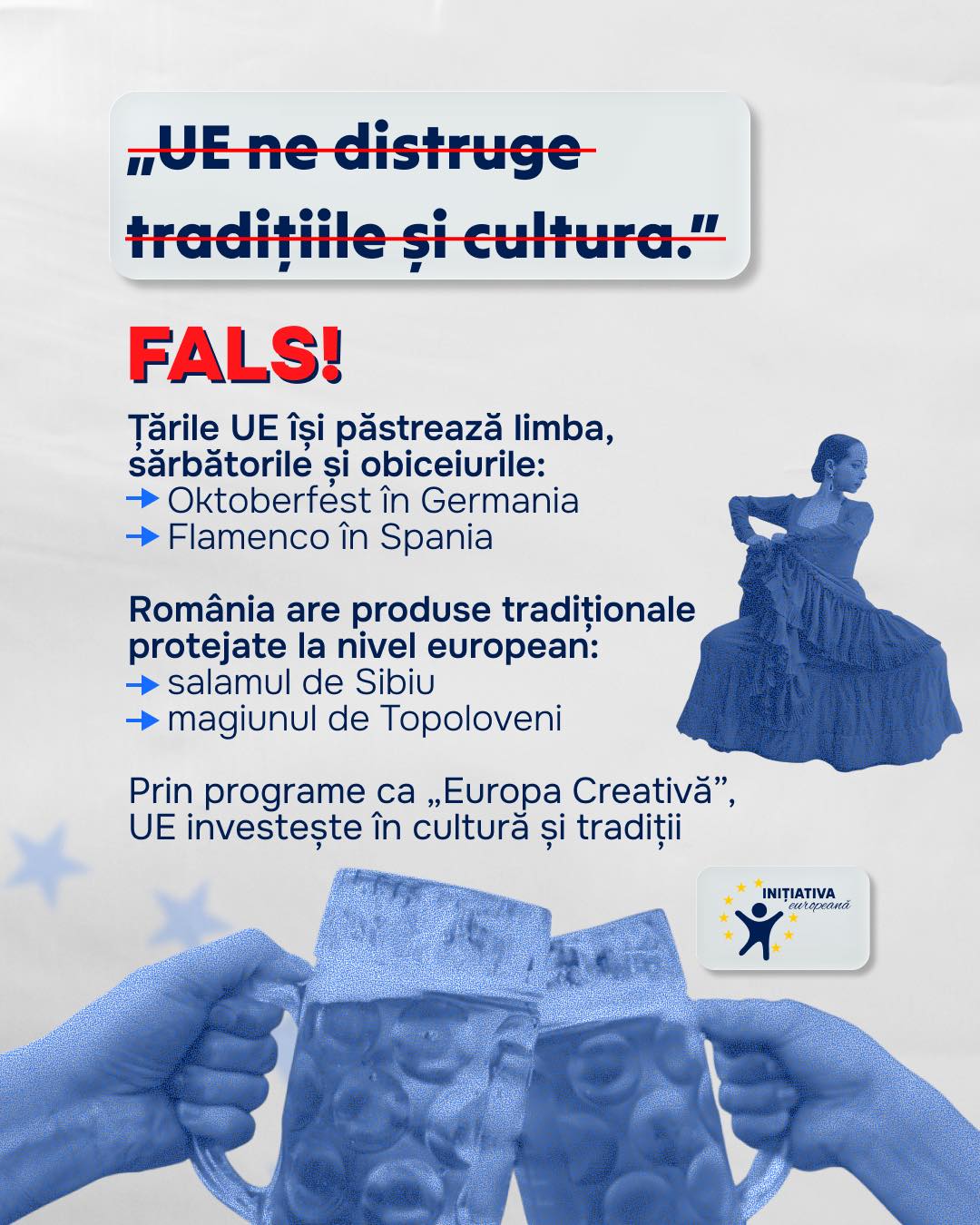 Un alt fals des întâlnit este că Uniunea Europeană ar vrea să ne distrugă tradițiile și cultura. Adevărul este exact opus. UE promovează diversitatea.