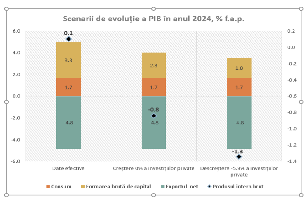 În anul 2024, Moldova a evitat pe muchie recesiunea, iar Produsul Intern Brut a înregistrat o creștere modestă de +0,1%. Mult sub ceea de ce are nevoie țara noastră. Totuși, într-un scenariu în care investițiile private, în loc să crească cu 12,4%, ar fi fost cu zero creștere (precedenții doi ani acestea fiind în scădere continuă - vezi graficul de mai sus), anul 2024 s-ar fi soldat cu o descreștere a economiei de -0,8%, influențând negativ sentimentul economic și perspectivele de creștere pentru următorii ani. Iar, dacă investițiile private ar fi continuat tendința anului 2023, când au fost în descreștere cu 5,9%, PIB s-ar fi redus cu -1,3% (restul indicatorilor rămânând la același nivel).