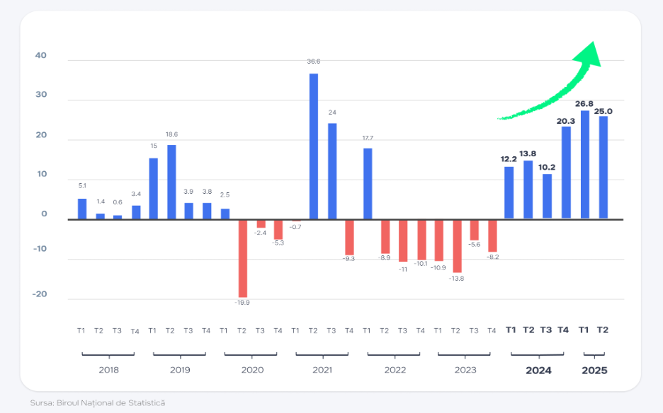 Lichiditatea suplimentară a companiilor s-a transformat practic imediat în investiții în active imobilizate - mașini, echipamente, mijloace de transport, tehnologie, softuri. Exact tipul de cheltuieli care conduc la creșterea productivității. Acestea au crescut în 2024 față de 2023 cu 12,4% (doar investiții private). În 2025 tendința a continuat, cu o creștere de aproape 26% în prima jumătate de an față de aceeași perioadă a anului 2024, chiar ținând cont de baza de comparație deja mare. Un semnal clar că mediul de afaceri a investit în pofida volatilității și a incertitudinii.