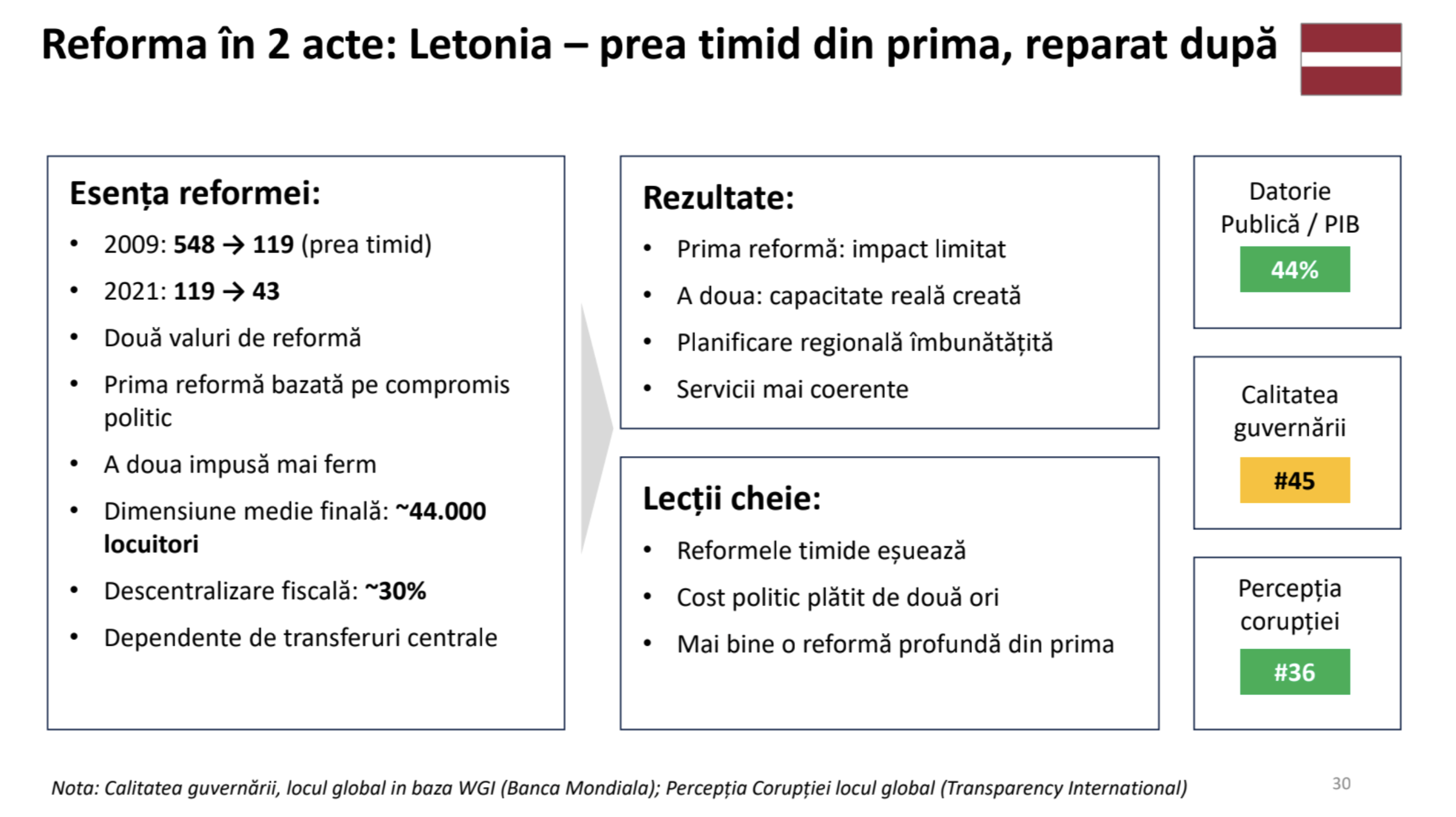 Astăzi se discută o reducere la aproximativ 300 de primării și 10 raioane. Este un pas înainte, dar riscă să fie un pas prea mic pentru dimensiunea problemei. Avem deja un exemplu clar în Europa. Letonia a redus în 2009 numărul de municipalități de la 548 la 119. A fost considerată o reformă ambițioasă. În realitate, a fost un compromis. După doar un deceniu, s-a constatat că multe dintre aceste unități sunt în continuare prea mici pentru a funcționa eficient. În 2021, Letonia a reluat reforma și a redus numărul la 43. Au plătit costul politic de două ori pentru a ajunge acolo unde puteau ajunge din prima.