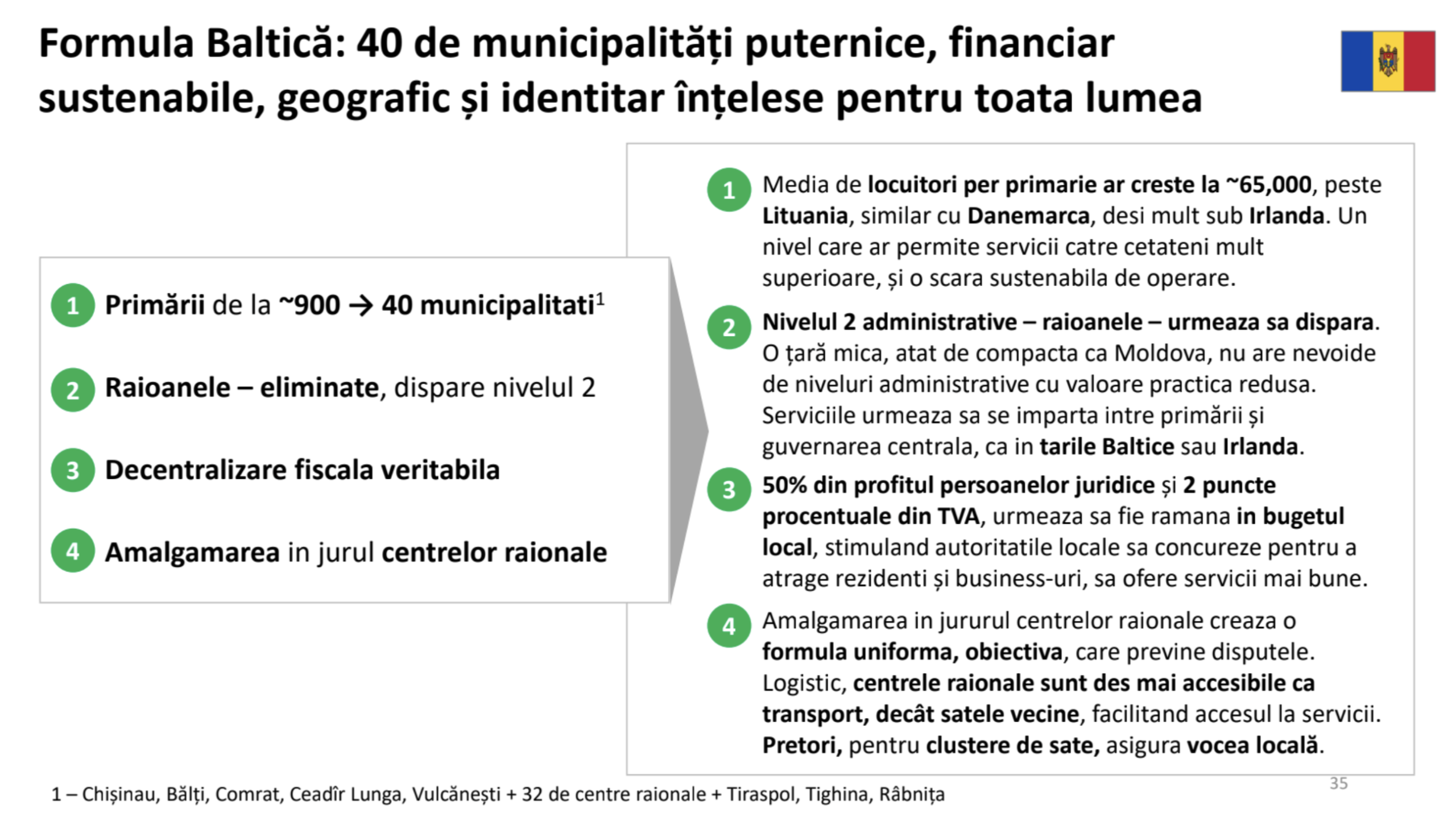 La fel de important este modul în care se face consolidarea. A forța sate să se unească între ele creează tensiuni și blocaje. O abordare mai logică este consolidarea în jurul centrelor raionale existente, care sunt deja hub-uri economice și sociale. Un model de aproximativ 40 de municipalități ar crea suficientă masă critică pentru administrații funcționale.